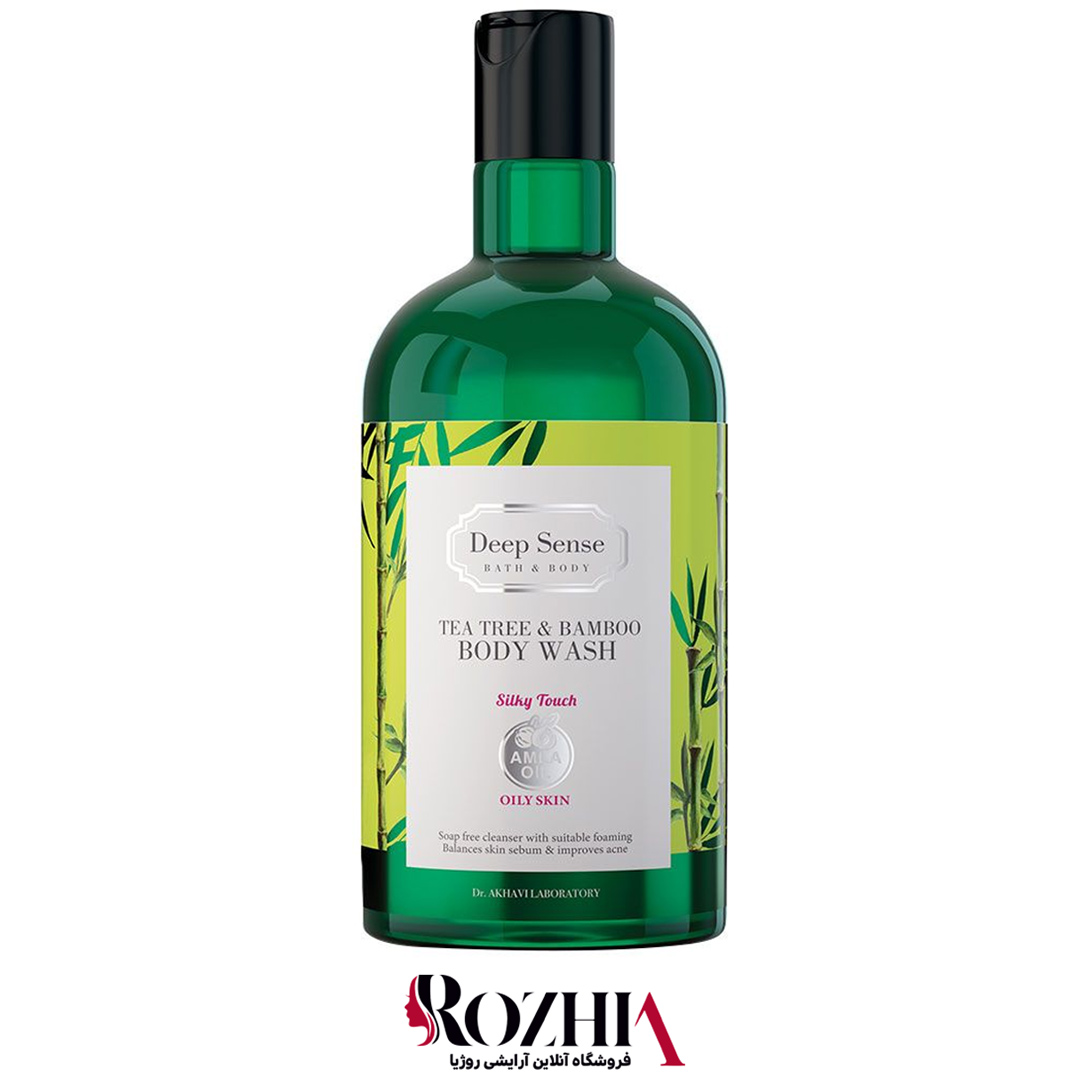 شامپو بدن پوست چرب درخت چای و بامبو دیپ سنس یک شوینده ملایم است که برای پوست های چرب و مستعد آکنه طراحی شده است. حاوی عصاره درخت چای و بامبو است که هر دو به دلیل خاصیت پاک کنندگی و قابض بودن شناخته شده اند. این شامپو به از بین بردن چربی و کثیفی اضافی از پوست بدون ایجاد خشکی یا تحریک کمک می کند. همچنین برای کمک به کاهش ظاهر جوش و آکنه طراحی شده است.